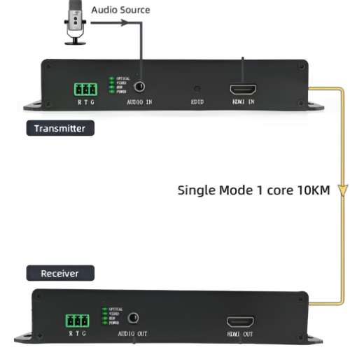 Amuse Tech Solutions optic extender has uncompressed digital HD video and high-speed digital optical fibre transmission technology advanced, it can transfer signal source (computer signal source, HD video signal source, HDMI HD signals output from HD DVD or DVR) to long distance terminal easily, up to 6.21 mi (10 KM), with strong anti-interference performance, ensure the signal completed and stable.