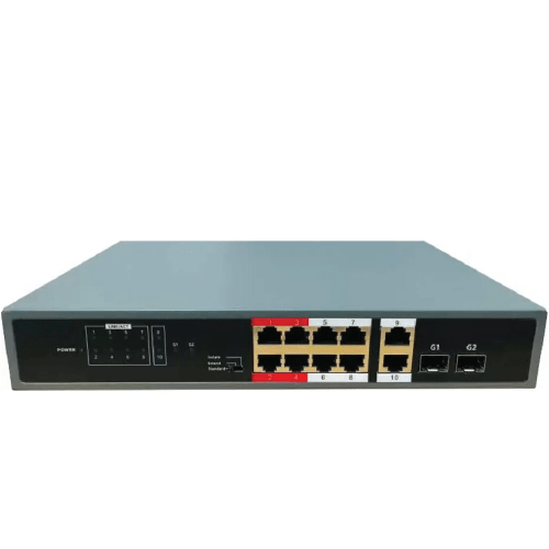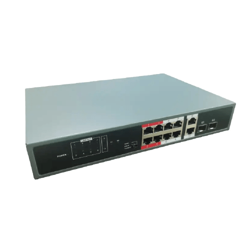 Amuse Tech Solutions swift net supports full Gigabit connectivity, offering 8 PoE ports, 2 Uplink RJ 45 ports, and 2 SFP ports.