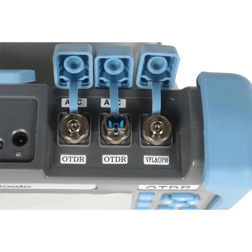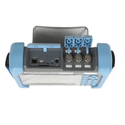 7” TFT-LCD OTDR with 12 hrs battery, 4 USB ports, 4 GB internal memory, and IP65 rating. Operates in -10°C to +50°C, with fast charging and multiple language options.