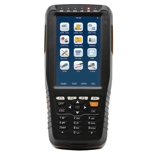 Multi-functional VDSL tester with xDSL testing, PPPoE, DMM, TDR, optical power meter, visual fault locator, and rechargeable battery.