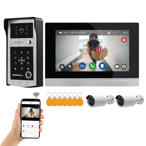 Wi-Fi video doorbell with 2MP HD camera, remote access , motion detection, fingerprint, and password unlocking for secure home entry.