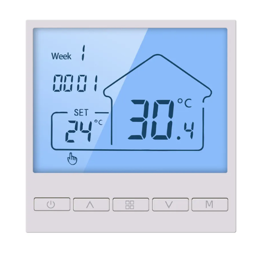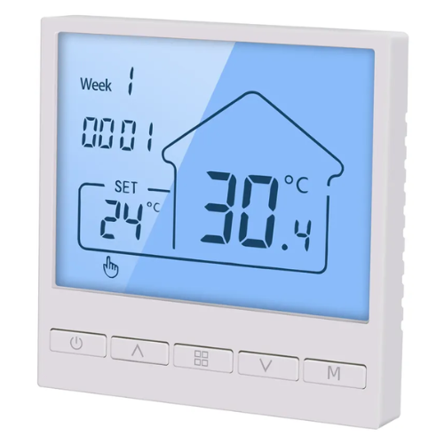 Intelligent water heating thermostat, a floor heating system for room temperature control and sub-floor temperature control, controls the operating status of the floor heating equipment by sensing the comparison between the ambient temperature and the set temperature. Improve comfort while achieving the purpose of energy saving. Intelligent water heating thermostat, is the use of microcomputer control technology, large LCD display, elegant design, beautiful and easy to operate, the thermostat has a manual automatic function, programmable function, state memory function