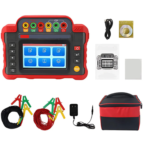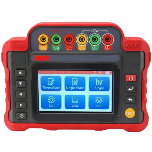 Multi-phase transformer tester with overload protection, Bluetooth app, large lithium battery, and touchscreen interface for efficient testing.