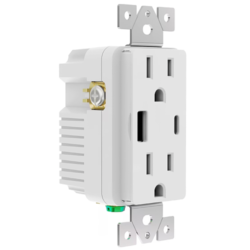 Amuse Tech Solutions’s Z-Wave charging in wall AC receptacle with USB-A & USB-C ports is a smart dual USB wall socket with Type-C fast charging. It features two standard AC outlets, a USB-A port, and a USB-C port, providing a convenient solution for charging multiple devices. This receptacle replaces any standard 15-amp wall outlet and includes a tamper-resistant safety mechanism for enhanced protection
