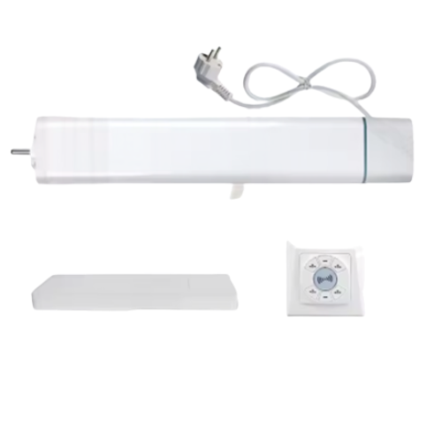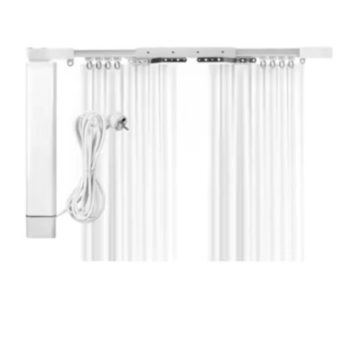 Z-Wave motorized curtain rail with electronic wall switch, aluminum track, eco-friendly design, and SmartThings control.