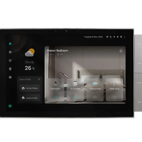 This 10.1 in smart panel offers 2 GB RAM, 8 GB storage, a 1280 x 800 resolution, AC 110 to 50 V voltage, and Wi-Fi, Zigbee, protocols for home control.