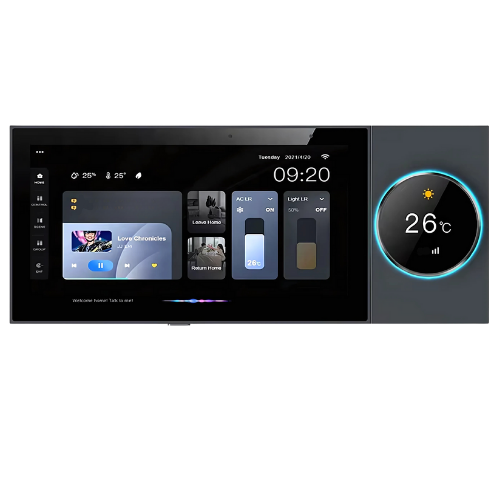 This smart home panel has 10 in IPS touch screen, voice control, and supports smart home devices for lights, curtains, and air conditioners.